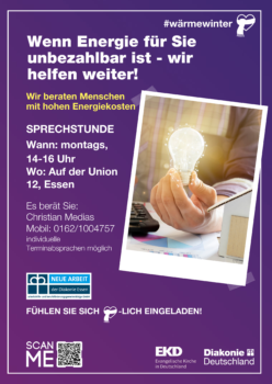 Die NEUE ARBEIT der Diakonie Essen beteiligt sich auch in diesem Jahr wieder an der Aktion #wärmewinter. Dazu gehört ein umfassendes Beratungsangebot für Menschen mit hohen Energiekosten oder Tipps zum Energiesparen. Wir informieren Sie zu Energiehilfen und helfen Ihnen bei Problemen mit Energiekosten. Weiterführend beraten Sie die Kolleg*innen vom EnergieSparService kostenlos dazu, wie Sie künftig Energie sparen können.